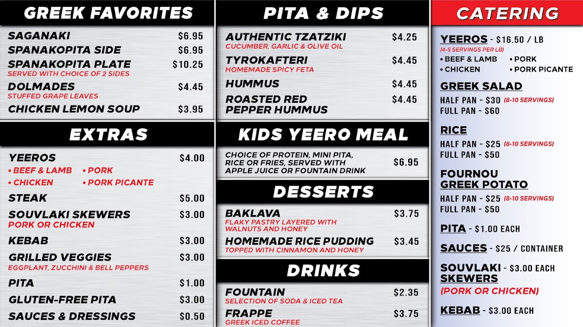 This menu is well suited for relaxed lunches, quick dinners, or casual gatherings where comfort and simplicity meet. Whether you’re craving the warm, savory notes of a classic pork souvlaki or seeking a fresh salad as a lighter option, the offerings complement the friendly, street-food atmosphere of the place. Homemade desserts like baklava add a sweet finish without overwhelming the overall dining experience.